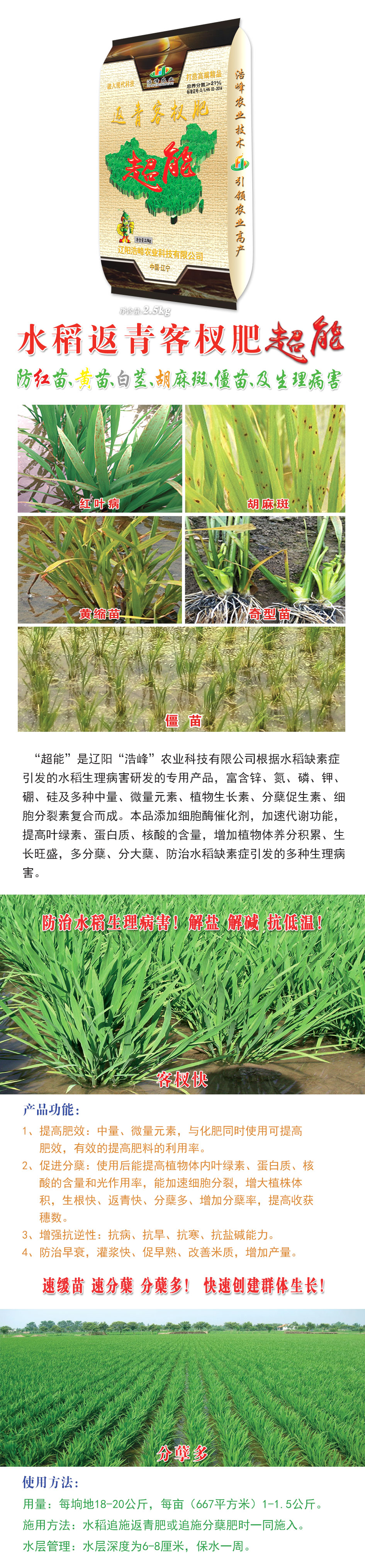 “超能”是遼陽“浩峰”農(nóng)業(yè)科技有限公司根據(jù)水稻缺素癥引發(fā)的水稻生理病害研發(fā)的專用產(chǎn)品,富含鋅、氮、磷、鉀、硼、硅及多種中量、微量元素、植物生長(zhǎng)素、分蘗促生素、細(xì)胞分裂素復(fù)合而成。本品添加細(xì)胞酶催化劑,加速代謝功能,提高葉綠 、蛋白質(zhì)、核酸的含量,增加植物體養(yǎng)分積累、生長(zhǎng)旺盛,多分蘗、分大蘗、防治水稻缺素癥引發(fā)的多種生理病害。